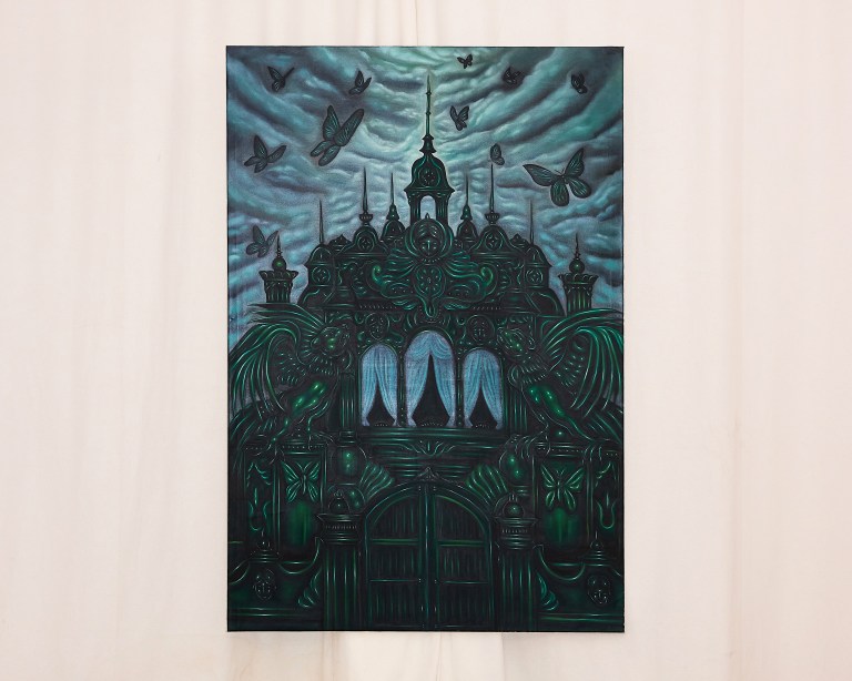 And there are statues of Zu, a deity from Mesopotamian mythology. It’s a god of storm, and I just thought people who are familiar with these things will catch that. Then the butterflies show the meaning of love and such. They are searching for the end of the storm. But basically the bottom part of the building is mainly shown. If you’ve been on an airplane, you might understand that it’s sunny over the clouds even if it was raining. There’s always light above the storm, and the main theme of this painting is always to search for an exit towards that light.