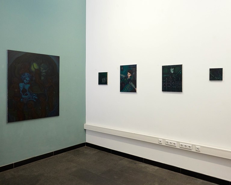 My friend pointed at this painting (↑) and told me it’s about cycles, and I agreed. It’s about the classic werewolf and Little Red Riding Hood tale in relation to my own confidence. It reflects moments of self-doubt or times when I don’t feel like engaging with others – a kind of cycle that occasionally comes around. I always can tell when it comes, and want to hide. Werewolves want to hide during a full moon, and I thought of that story. The werewolf eats granny, and it hides. So, the werewolf is wearing Little Red Riding Hood. I titled it “The Curse of Full Moon” because the full moon is also a cycle, and it gave me goosebumps, like, “Ah, I see”.