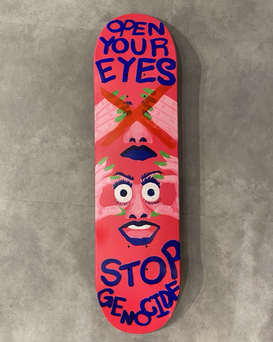Lately, my work has become more message-driven. I paint what I want to say to society on my decks. It’s especially like that now. Even when I’m skating, or carrying my board on the train, they show. When I go to protests, I figure, “Even if I don’t have anything else, I can just bring my deck.”